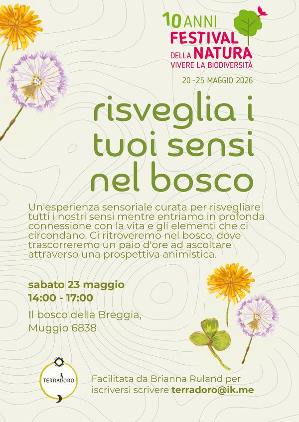 Un'esperienza sensoriale curata per risvegliare tutti i nostri sensi mentre entriamo in profonda connessione con la vita e gli elementi che ci circondano. Ci ritroveremo nel bosco della Breggia in Valle di Muggio, dove trascorreremo un paio d'ore ad ascoltare attraverso una prospettiva animistica. Facilitata da Brianna Ruland di Terradoro.