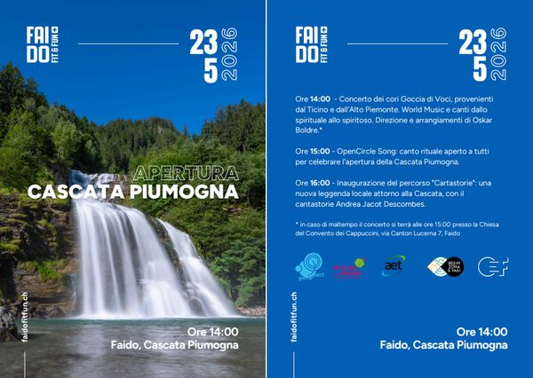 Alle ore 14:00 vi aspettiamo nel bosco a fianco della cascata Piumogna per il Concerto dei cori Goccia di Voci con coriste e coristi provenienti dal Ticino e dall’Alto Piemonte. Un concerto di World Music e canti dallo spirituale allo spiritoso. Direzione e arrangiamenti di Oskar Boldre. (In caso di maltempo il concerto si terrà alle ore 15:00 presso la Chiesa del Convento dei Cappuccini, via Canton Lucerna 7, Faido)